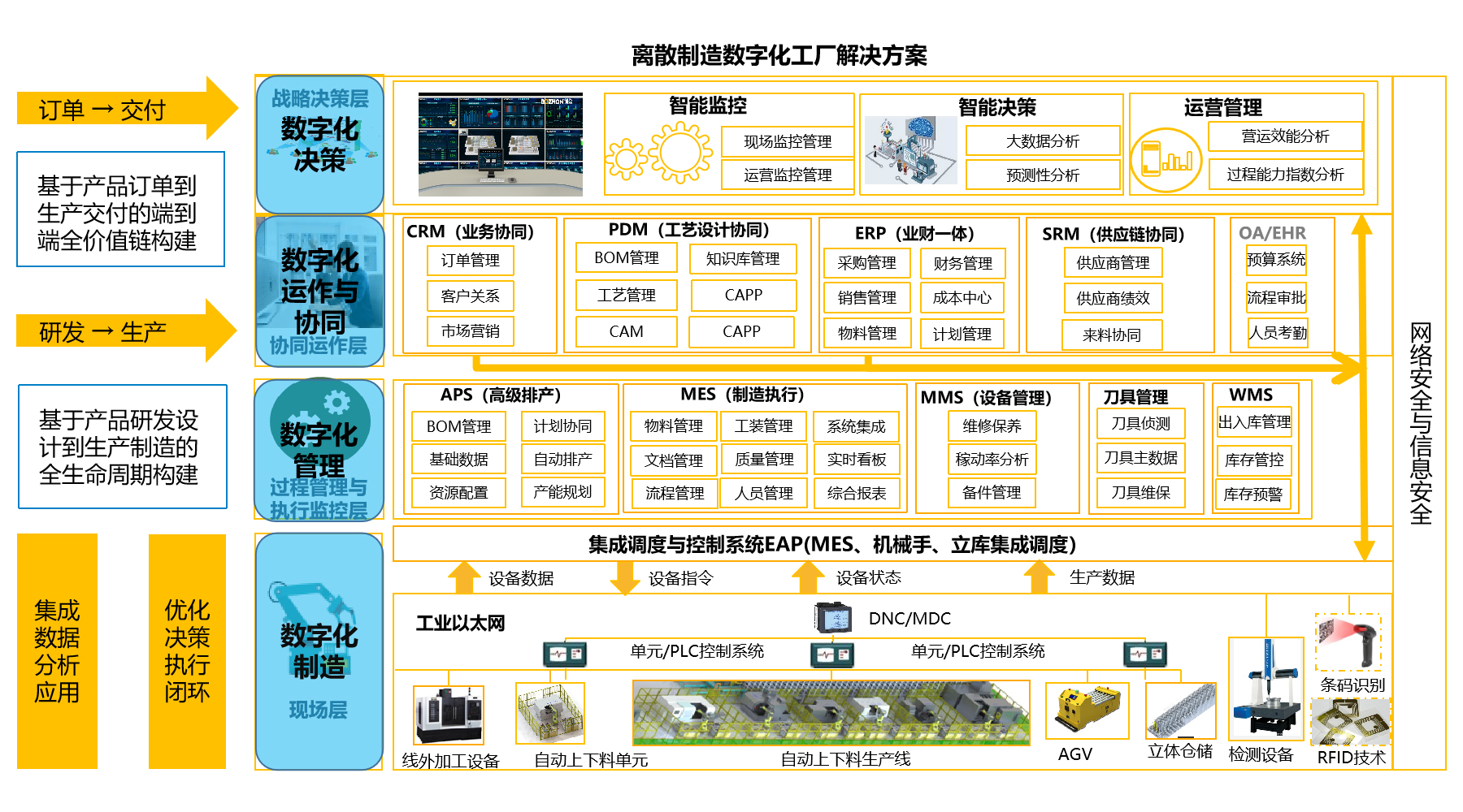 该方案通过IT与OT的高度融合,将ERP、PLM、APS、MES、MMS等系统与智能上下料设备、智能生产设备、智能检测设备无缝串联,实现生产全过程的数字化制造、数字化管理与数字化决策。