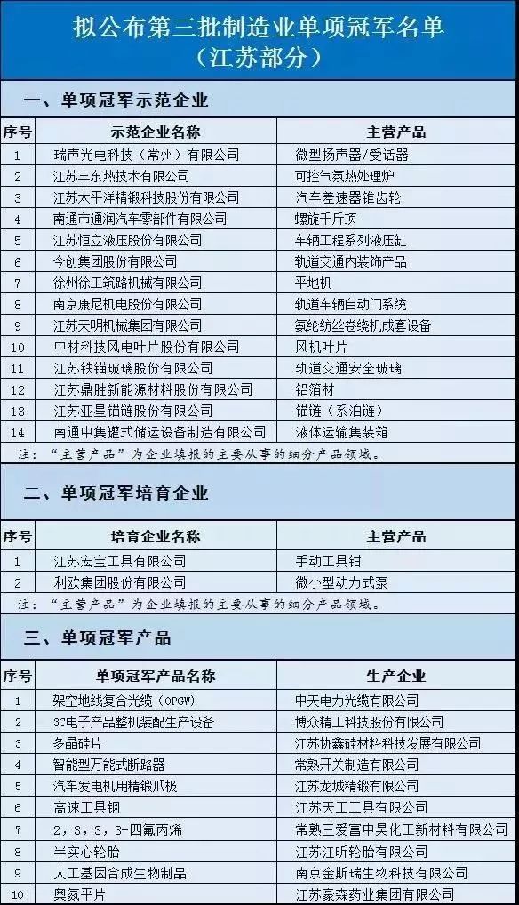 为率先突破重点关键领域,提升制造业国际竞争力,树立江苏制造新形象,近年来,我省大力实施制造业“单项冠军”企业培育提升专项行动,该项工作已列入省政府的重点工作任务。