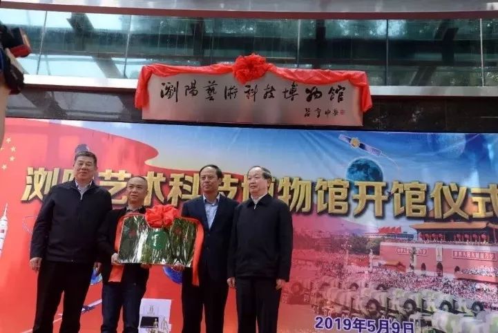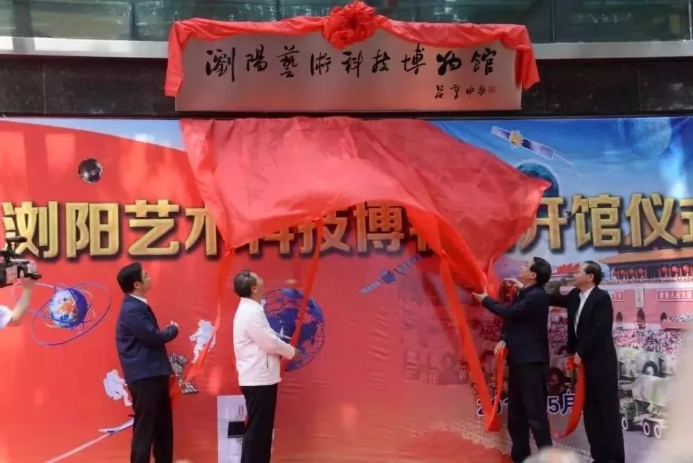 (湖南省委军民融合发展委员会办公室常务副主任黄东红;长沙市科技局党组书记、局长郭塨;原国防科工委司长、中国遥感应用理事长罗格;浏阳市委副书记、市长吴新伟为“浏阳艺术科技博物馆”揭牌)